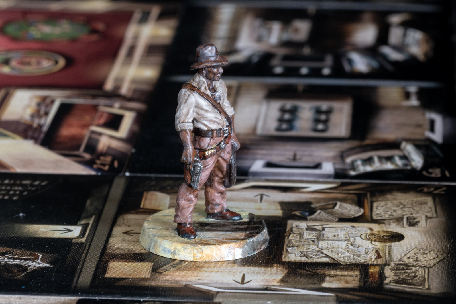 ジョン・モーガン。ボードゲーム「クトゥルフ 死もまた死すべし」のコマ。 2025年7月29日に完成。 シタデルで塗り分けた後、シタデルのシェイドで陰影をつけ、上からハイライトを塗るなど。 銃はラッカー。目のあたりにはエナメルも。