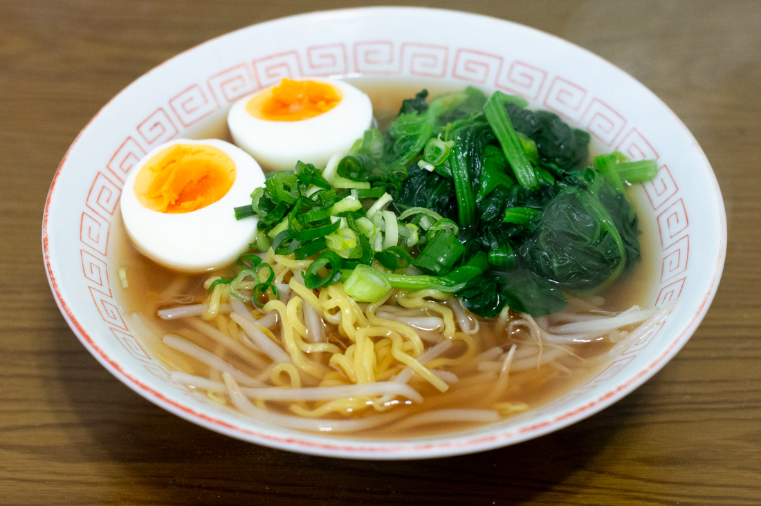 具材はゆで玉子とほうれん草とモヤシとネギ。