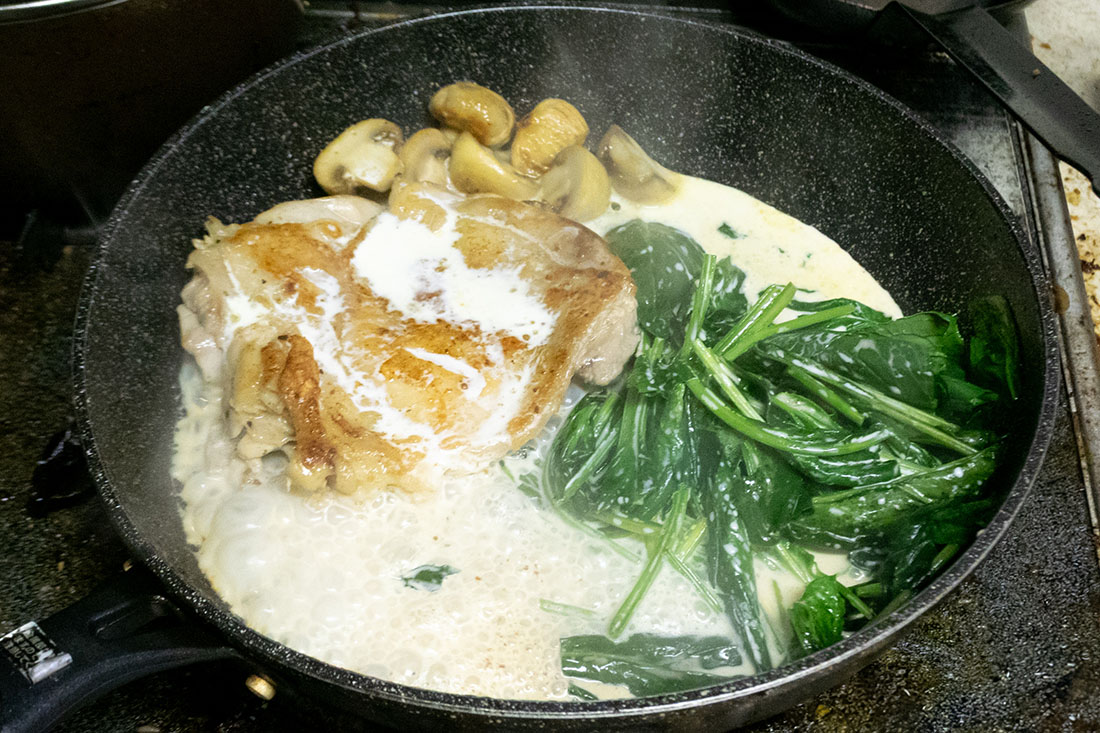 材料:鶏もも肉、マッシュルーム、ほうれん草、にんにく、オリーブオイル、バター(無くてもOK)、白ワイン、ハーブ入り塩胡椒、生クリーム、黒胡椒