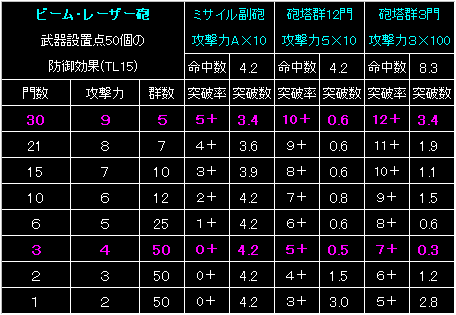 反重力砲による防御射撃の特徴は、突破不可能なレベルの防御突破率にあります。 副砲から発射される、攻撃力Aのミサイルを確実に防御できる兵器は、反重力砲だけでした。 50トンの反重力副砲(攻撃力5)で、攻撃力Aのミサイルを防御することは、必ずしも保証できないのですが、それ以外ならば完璧です。 反重力砲の弱点は、副砲にしか設置できないため数を用意できないこと、ミサイル以外の兵器には使えないこと、以上の2つでしょう。 表6 ミサイルに対して防御射撃を行なった場合の損傷期待値比較 (攻撃力3の非核弾頭ミサイル×100砲塔群、遠距離) |