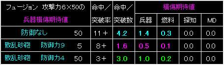 攻撃力5のフュージョン・ガン攻撃に対しては、防御力4の散乱砂砲も、防御力9の散乱砂砲も有効です。 表17 フュージョン・ガンに対して防御射撃を行なった場合の損傷期待値比較 (攻撃力6のフュージョン・ガン×50砲塔群、近距離) |