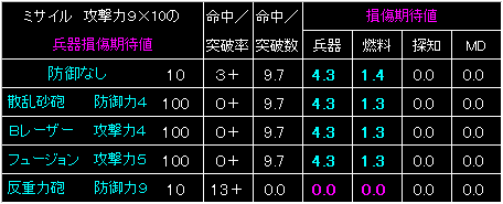 ビーム・レーザーによる防御射撃の効果は、散乱砂砲の場合とほぼ同じです。 攻撃力3のミサイルに対しては、三連架砲塔1基(攻撃力4)の砲塔群による防御が最も効率的ですが、攻撃力9のミサイルに対しては、まったく効果がありません。 三連架砲塔10基30門をまとめた、攻撃力9のビーム・レーザー砲塔群でも、あまり防御効果がありませんでした。 表4 フュージョン・ガンによる防御射撃の効果 |