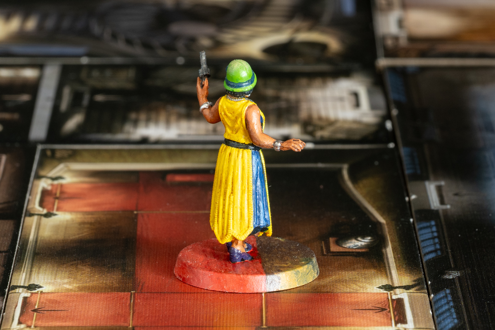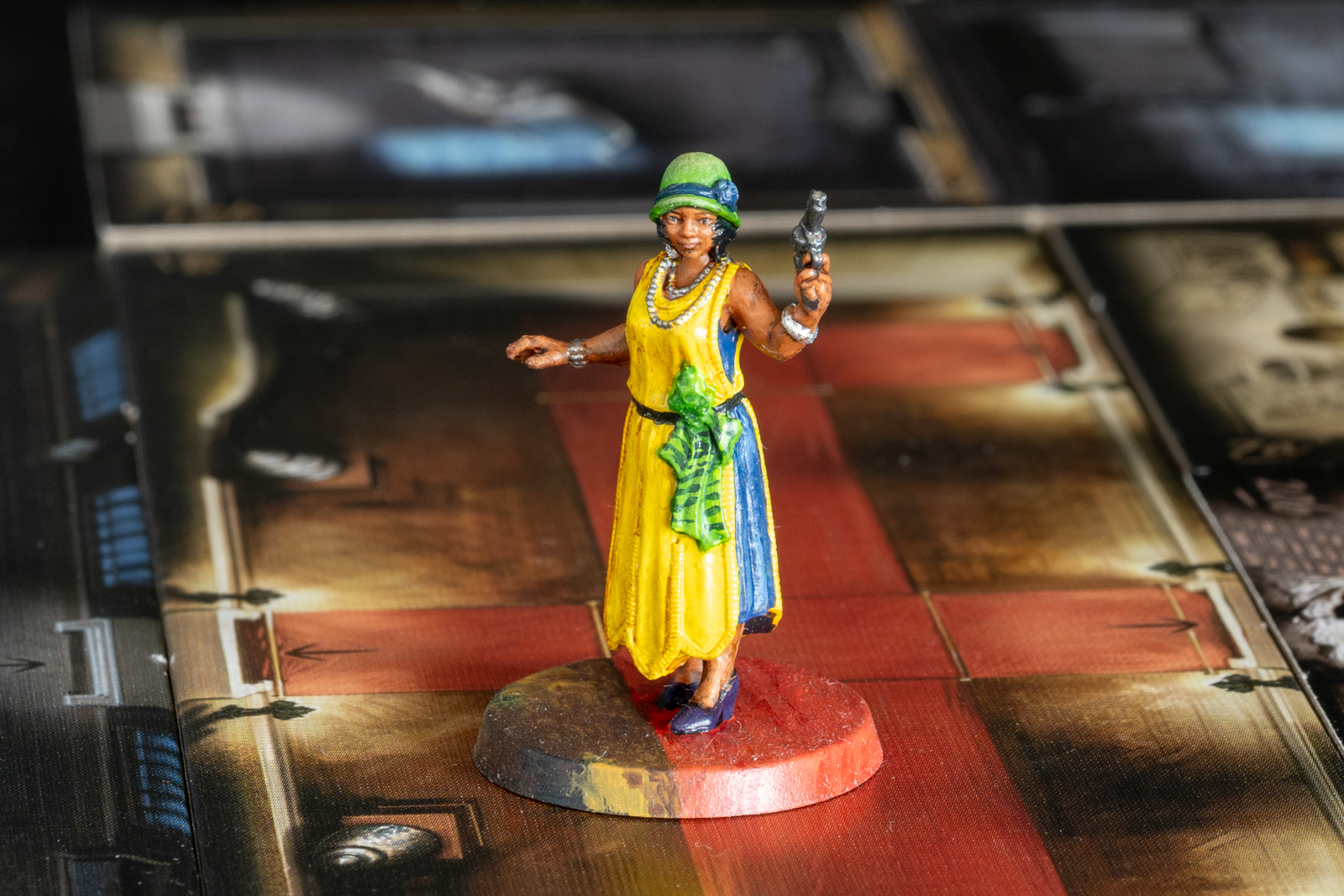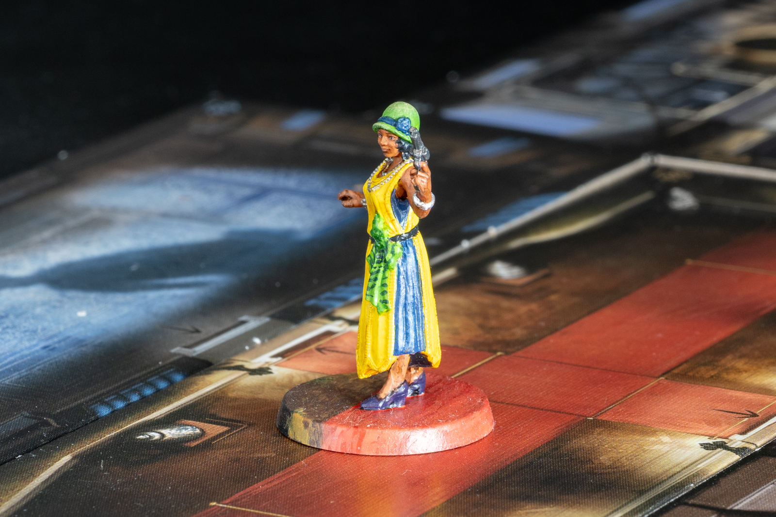 エリザベス・アイヴズ。ボードゲーム「クトゥルフ 死もまた死すべし」のコマ。 2023年6月21日に完成したが、あとで土台部分をタイルに馴染むように加筆した。 シタデルをメインに、メタリックな部分はラッカーで塗り分けた後、シタデルのシェイドで陰影をつけ、上からハイライトを塗るなど。