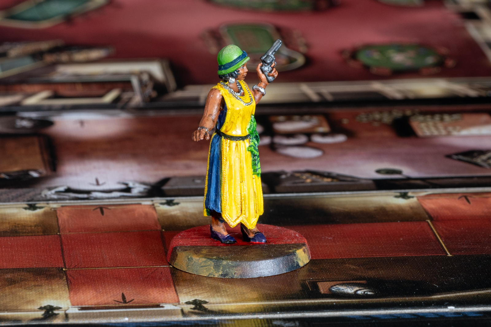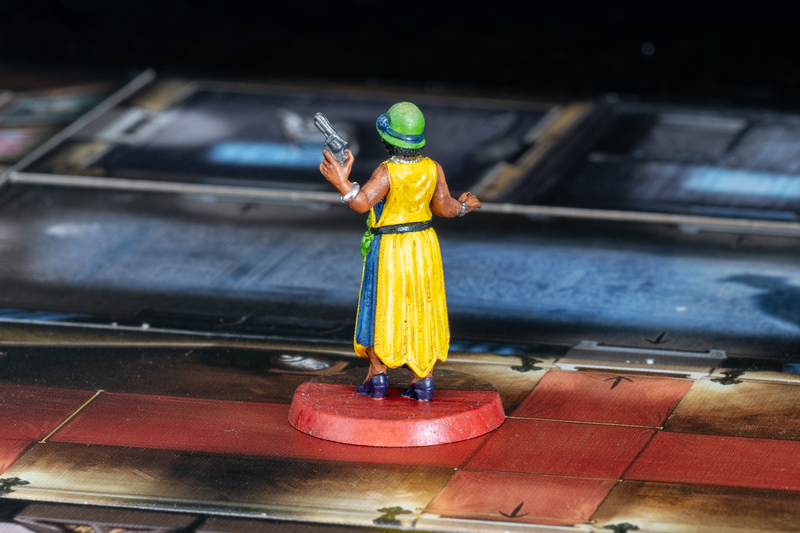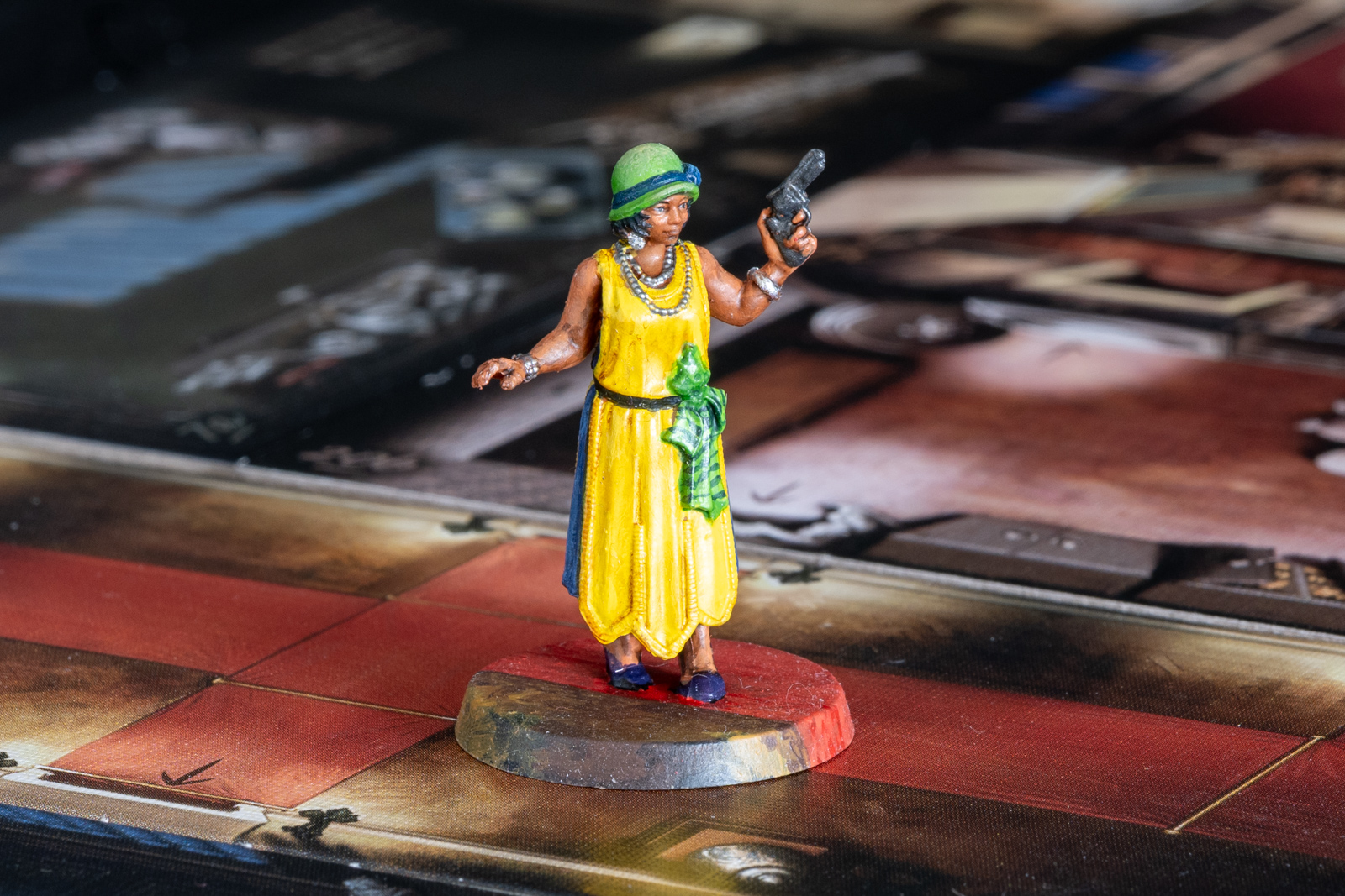 エリザベス・アイヴズ。ボードゲーム「クトゥルフ 死もまた死すべし」のコマ。 2023年6月21日に完成したが、あとで土台部分をタイルに馴染むように加筆した。 シタデルをメインに、メタリックな部分はラッカーで塗り分けた後、シタデルのシェイドで陰影をつけ、上からハイライトを塗るなど。