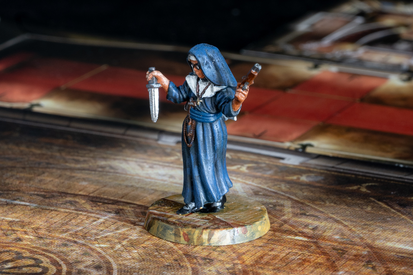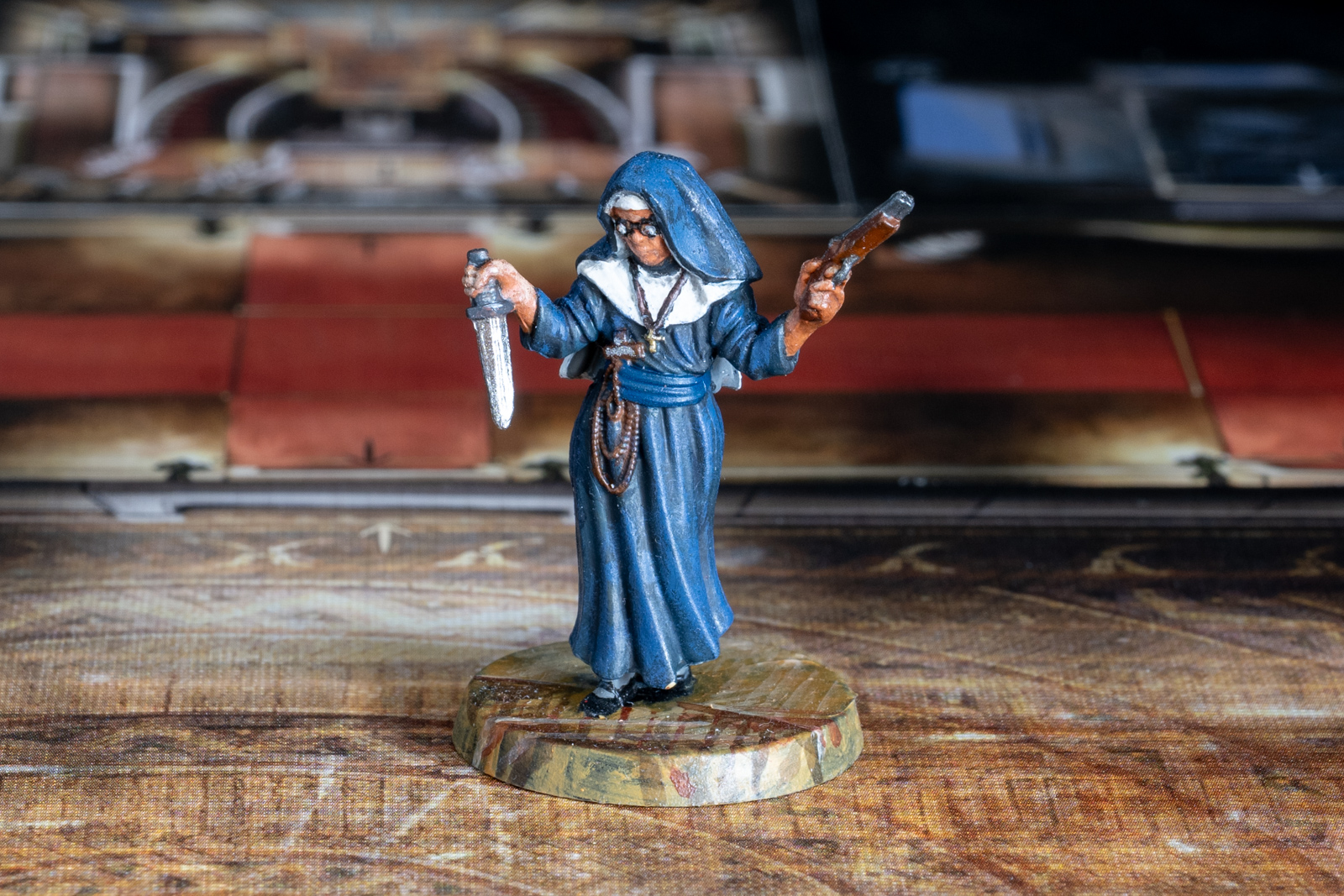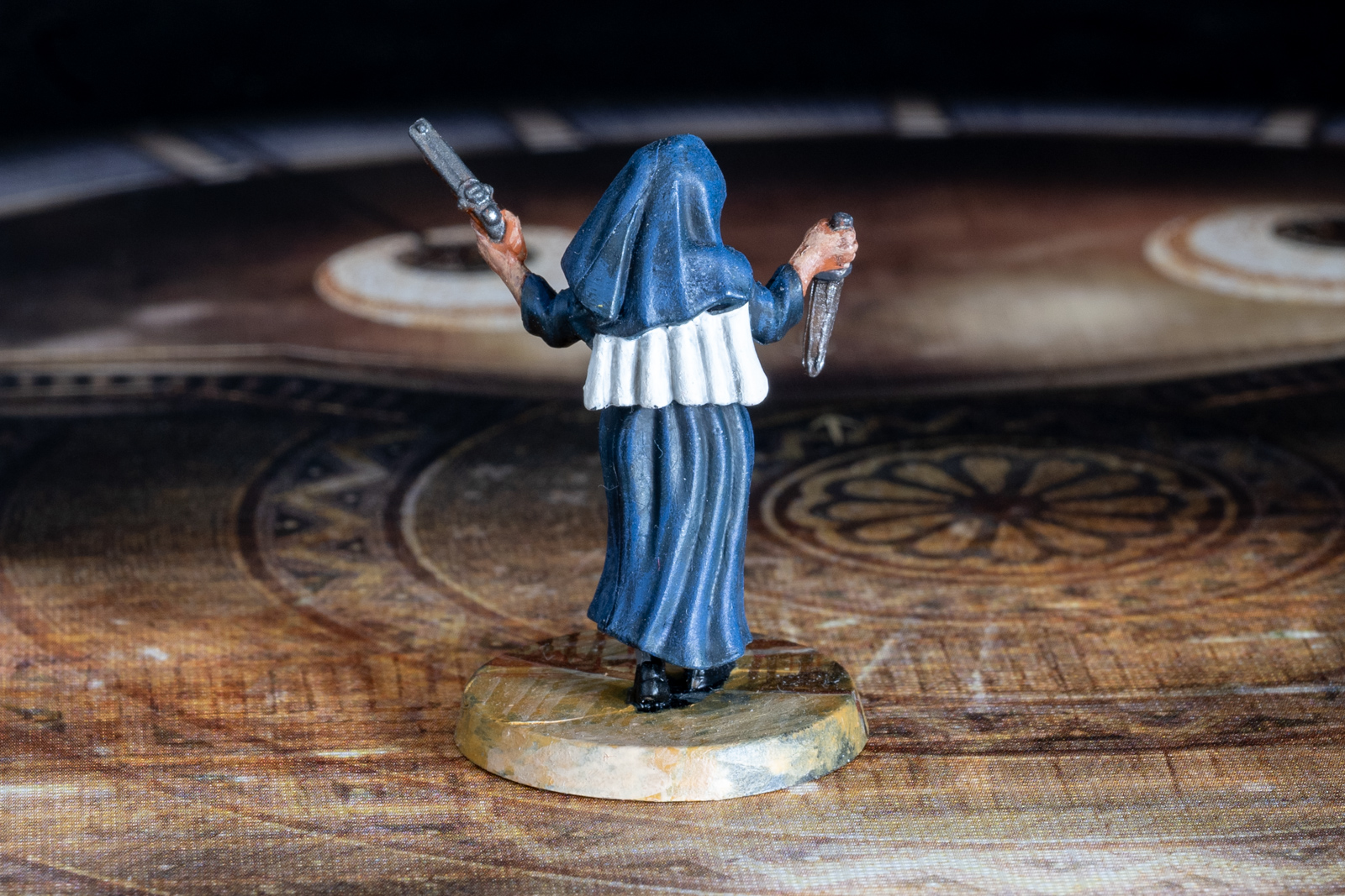 シスター・ベス。ボードゲーム「クトゥルフ 死もまた死すべし」のコマ。 2023年4月8日に完成したが、あとで土台部分をタイルに馴染むように加筆した。 シタデルをメインに、メタリックな部分はラッカーで塗り分けた後、シタデルのシェイドで陰影をつけ、上からハイライトを塗るなど。
