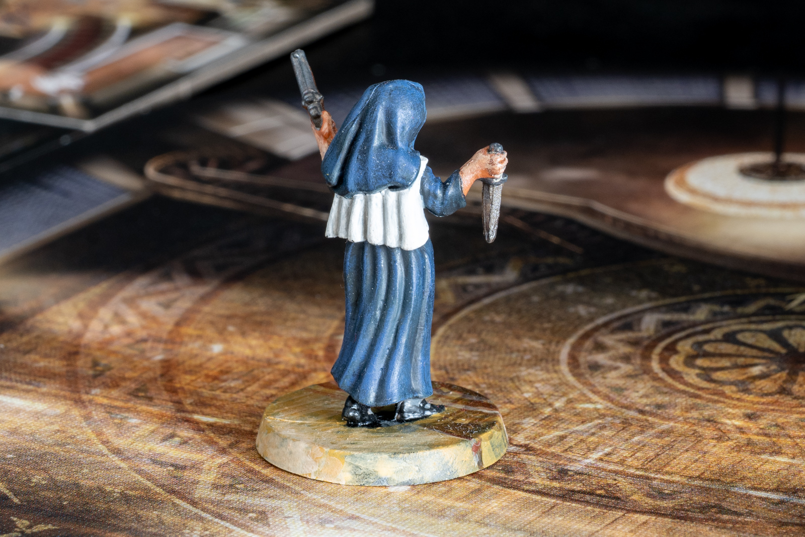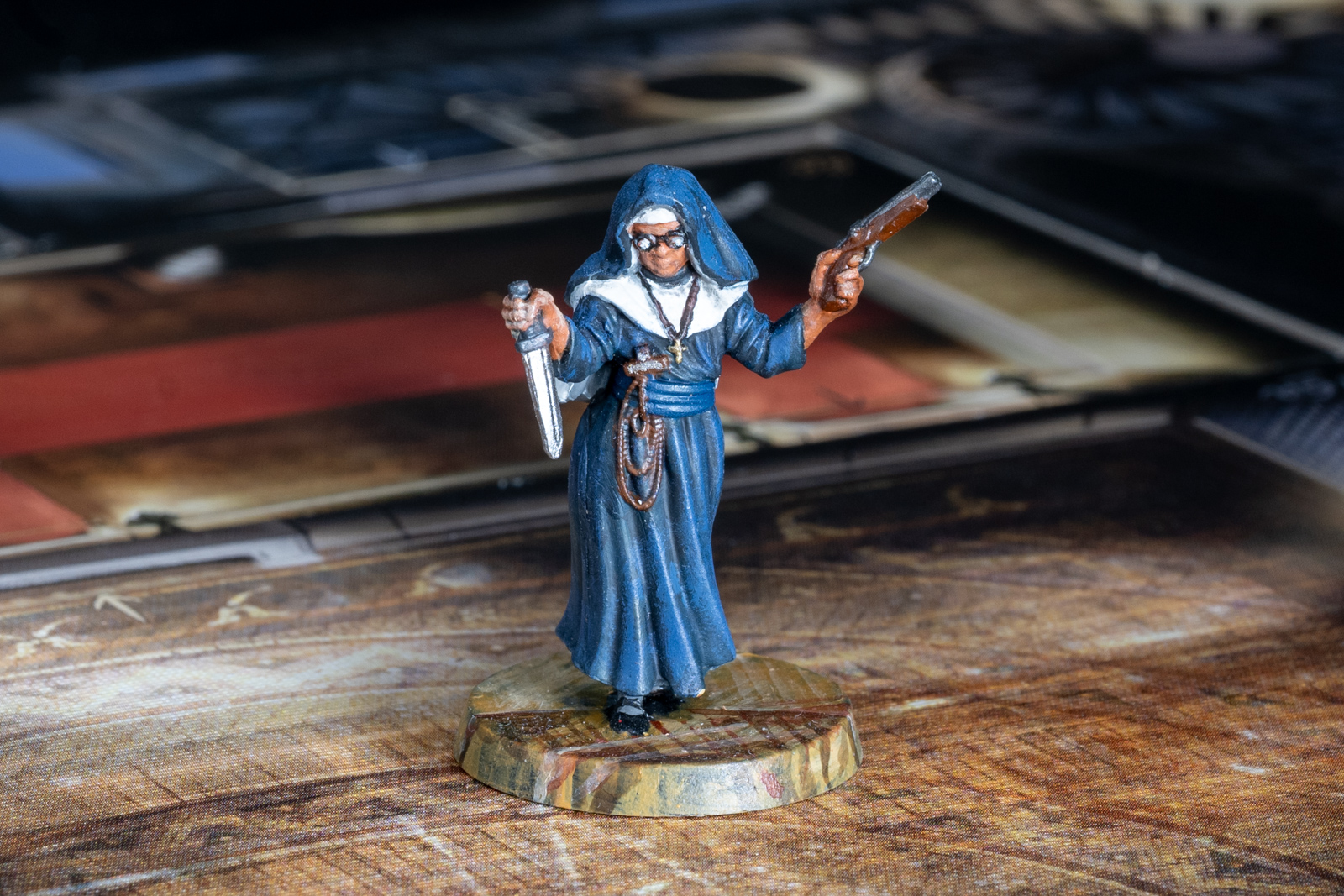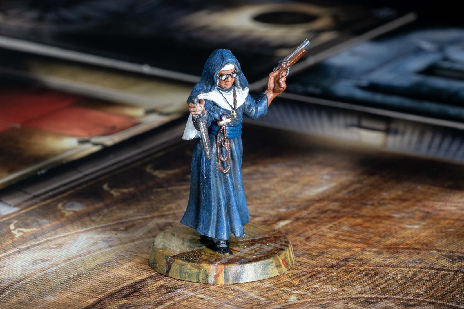 シスター・ベス。ボードゲーム「クトゥルフ 死もまた死すべし」のコマ。 2023年4月8日に完成したが、あとで土台部分をタイルに馴染むように加筆した。 シタデルをメインに、メタリックな部分はラッカーで塗り分けた後、シタデルのシェイドで陰影をつけ、上からハイライトを塗るなど。