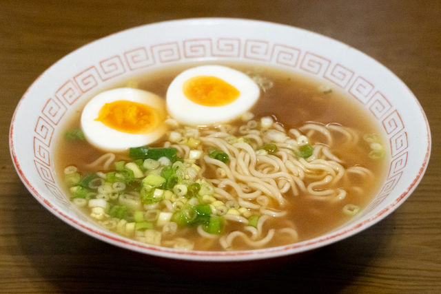 最近一部で話題のメーカー(笑) 具材:ゆで玉子、ネギ 塩味のものと同じと思われる太い麺が特徴的。 しかし今回はスープとの相性か、茹で加減か、なんだかラーメンと言うよりもちゃんぽん麺みたいな感じでもう一つ。 スープはこれといったクセのない胡椒の合いそうな味だが、麺から溶け出したもののせいかにごりが目立ったので、茹で汁とスープは別で作ったほうがいいかも。