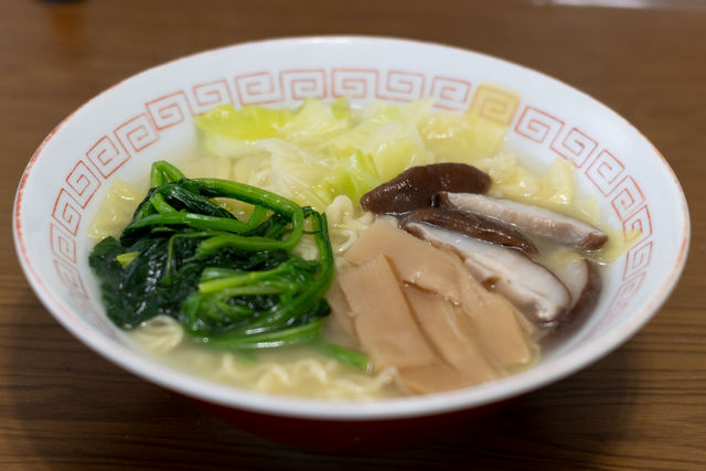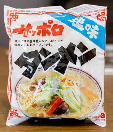 見たことのないラーメンが売っていたので買ってみた。 パッケージの古臭いデザインが気に入った(笑) 具材:ほうれん草、シイタケ、キャベツ、メンマ。 なかなか美味い。 サッポロ一番塩ラーメンに似たスープに袋入麺では珍しいくらいの太麺で、野菜がよく合う。 チャンポンみたいに柔らかく茹でても美味しそう。
