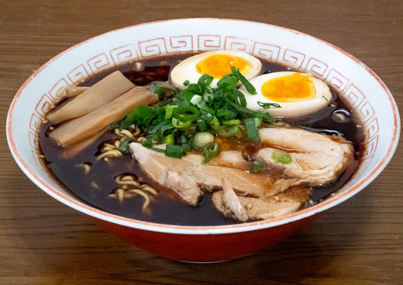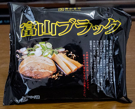 具材:手作りチャーシュー、煮卵、メンマ、ネギ 袋にも書いてあるが、胡椒が効きまくり。 濃い醤油ラーメンにテーブル胡椒を限界までかけたらこの味になる(汗) うまいのはうまいのだが。 麺はノンフライでやっぱり食感が今ひとつ。茹で方かなあ。