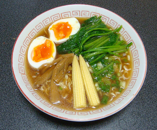 具材:ほうれん草、メンマ、ベビーコーン、ゆで玉子、ネギ