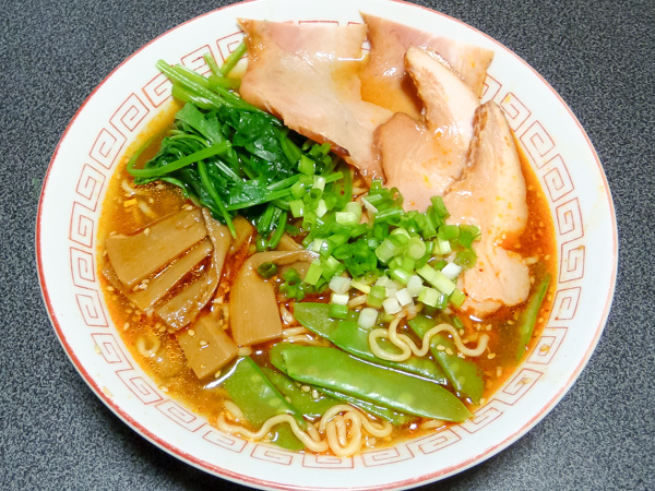 具材:ほうれん草、絹さや、メンマ、焼豚、ネギ。 ノンフライ麺の元祖。 やはりノンフライ麺はうまい。うまいけど、普通の油揚げ麺や生麺とはやっぱり別ジャンルな感じ。 スープがまた他のインスタントラーメンとは一線を画す風味。 昔と変わらずうまい。 でも具が和風ラーメンっぽくなって、なんだか変な感じ(汗)
