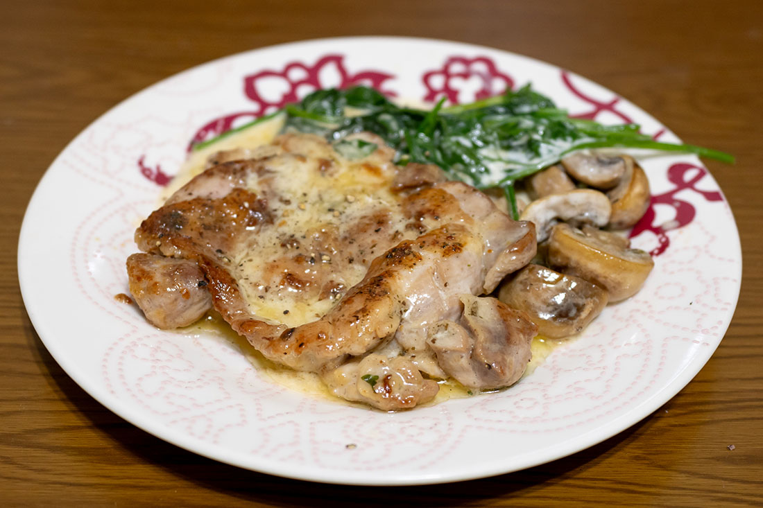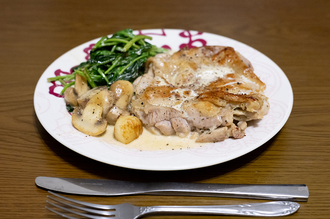 材料:鶏もも肉、マッシュルーム、ほうれん草、にんにく、オリーブオイル、バター(無くてもOK)、白ワイン、ハーブ入り塩胡椒、生クリーム、黒胡椒