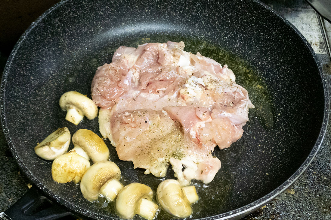 中弱火である程度火が通ったら半分に切ったマッシュルームを投入。